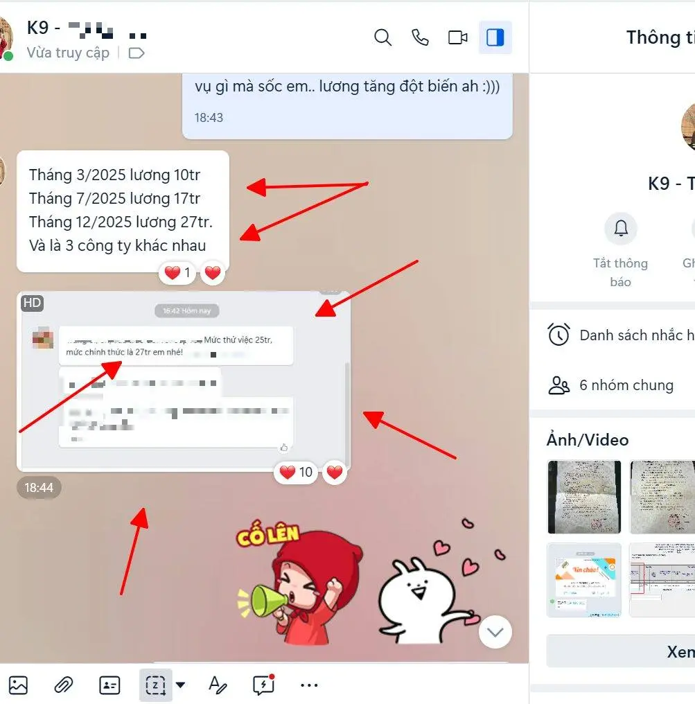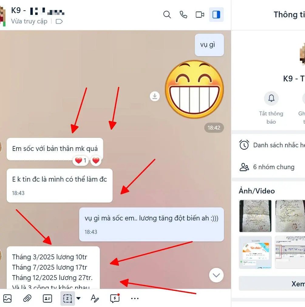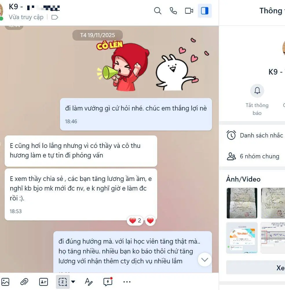 Hỗ trợ trên công việc kèm 1-1 mãi mãi. Ai muốn nhảy job mới với mức lương cao sẽ được hỗ trợ từ khâu viết CV, săn việc, nghiên cứu nhà tuyển dụng và chuẩn bị cho phỏng vấn. Sau khi đậu job, tiếp tục được hỗ trợ trong thời gian thử việc.